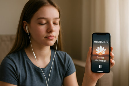 Teenager with closed eyes using a guided meditation app on a smartphone, wearing earphones, promoting relaxation and mindfulness in a cozy setting