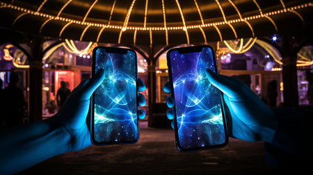 Two hands are illuminated by colorful lights, holding smartphones that showcase bright, abstract digital designs amidst a lively nighttime atmosphere filled with festive decorations.