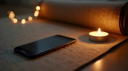 A smartphone switched off beside a candlelit yoga mat, Ai generated image