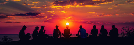 Silhouette of a group of people on the background of the setting sun, A group of believers engaged in a circle of prayer with soft, serene bokeh, AI Generated