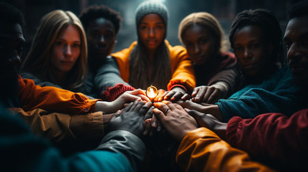 A diverse group gathers, placing hands together in a symbol of unity and support during a community event in the evening atmosphere, promoting togetherness.