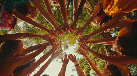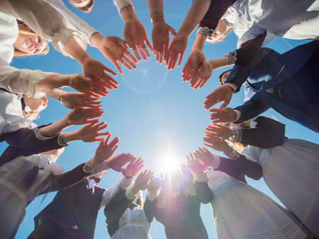 School friends uniting in a circle with their hands, demonstrating teamwork, unity, and friendship under a clear blue sky