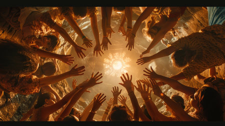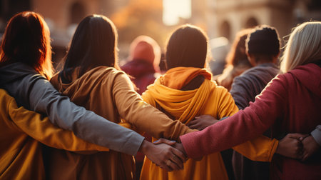 A multi ethnic group holding hands in solidarity and togetherness generated by artificial intelligence