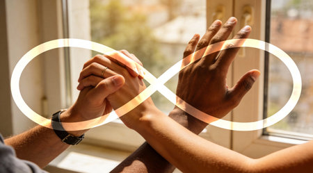 A creative digital illustration depicting Intertwined hands of diverse lovers with infinity symbol overlay, close-up textured skin composition, soft natural window light, documentary realism style, deep commitment mood, premium high-res stock. This AI-generated artwork features unique visual elements suitable for various commercial and editorial applications. AI-generated illustration.