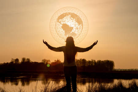 Global network support concept. Woman stands in front of the global network on the background of a sunny sunset.