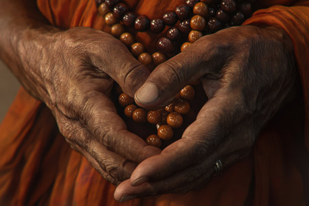 Closeup of a buddhist monks clasped hands, draped in a traditional orange robe