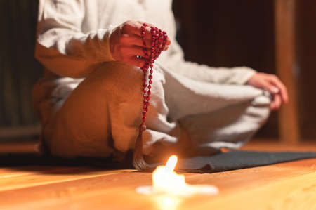 close-up man in clothes for practice and meditation sits in a lotus pose and holds red rosary to concentrate attention in a wooden room with dim light