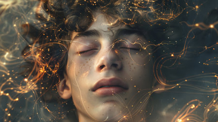 Dreamy Portrait of Young man Surrounded by Golden Sparkles