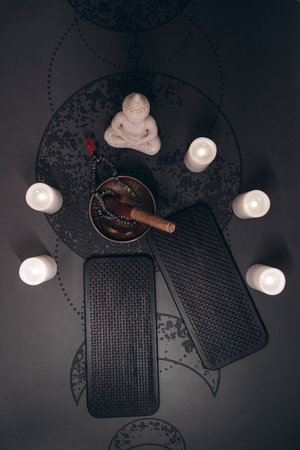 Meditation altar with Buddha statue, candles, and prayer beads. Top view