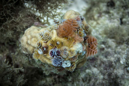 symbiosis of the reef. Fanworm, Sea Squirt and Christmas Tree Worm on a coral block