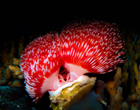 Beautiful bright red Christmas tree worm on the yellow coral reef. Black clean background, colorful tropical underwater reef. Tube-building worm belonging to the family Serpulidae.