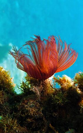 Calcareous tubeworm or fan worm, plume worm or red tube worm (Serpula vermicularis) extreme close-up undersea, Aegean Sea, Greece, Halkidiki, Kakoudia beach