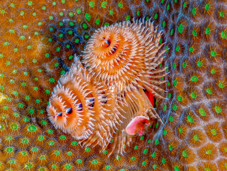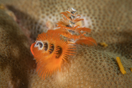 Christmas tree worm (spirobranchus giganteus) in the Bahamas against dark backrgound. Caribbean, December