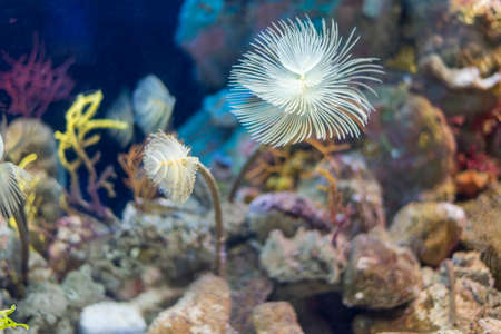 pink Tube anemone at the bottom of the aquarium on the blue background. Marine fish concept Ichthyology concept