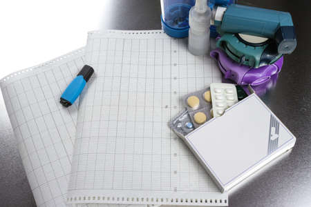 Peak flow meter, measurement of maximum expiratory rate and a blue inhaler with allergy spray, medical devices for asthma or COPD patients, copy space, selected focus, narrow depth of field