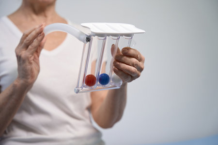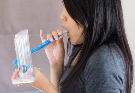 woman holding triflow and deep breathing to improve lung expansion, woman patient with chest rehabilitation by triflow device