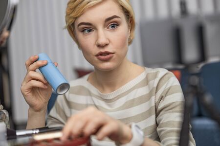 Pretty young woman showing makeup on camera