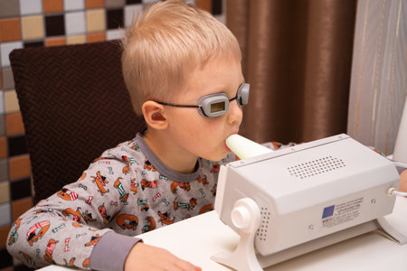 A fair-haired boy in pajamas undergoes prevention of viruses and diseases at home using a quartz germicidal irradiator.