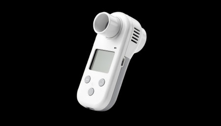 Handheld spirometer device isolated on white background designed for home lung function monitoring with wireless connectivity for telehealth integration.