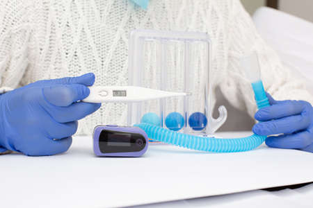 Asian woman patient using incentivespirometer or three balls for stimulate lung at home