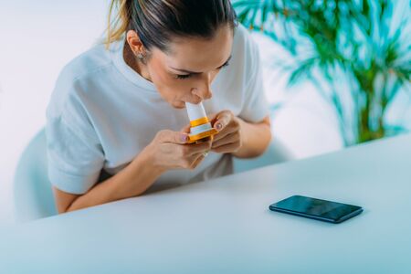 young woman irrigates her throat with medicated spray
