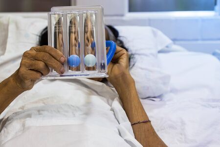 Female patient using Tri-ball Incentive Spirometer to practice deep breathing on the bed. Medical concept;treatment patient.