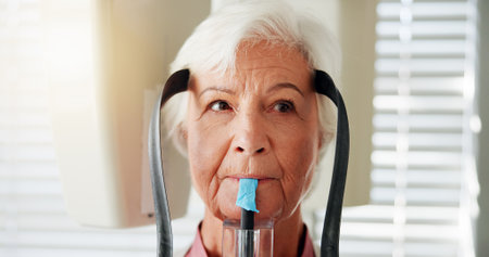 Medical, dental scan and senior woman in hospital for healthcare, assessment and examination. Xray procedure, patient and female person in clinic for oral hygiene, health test and consultation.
