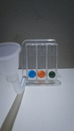 Patient using incentivespirometer or three balls for stimulate lung,Selective focus