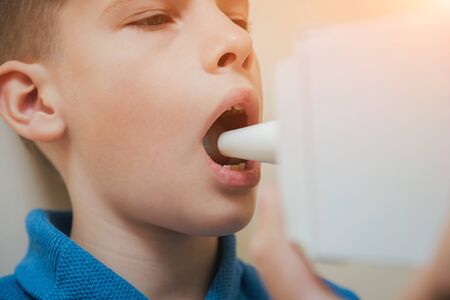 A young man is holding an asthma inhaler device while sitting on a couch