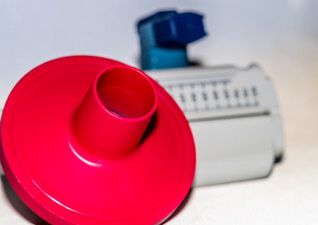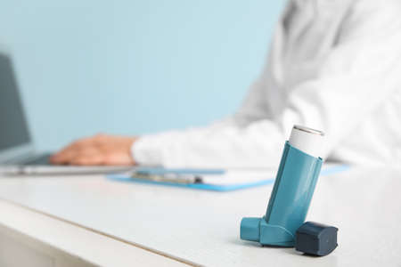 Modern inhaler on table of allergist in clinic