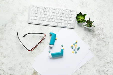 Asthma inhalers, eyeglasses, keyboard, pills and houseplants on light background