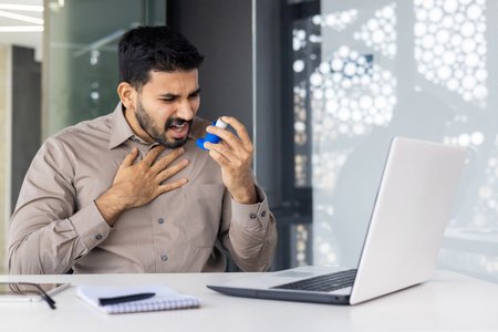 Young man experiencing an asthma attack while working at his office desk, holding an inhaler and clutching his chest, indicating discomfort and breathing difficulties