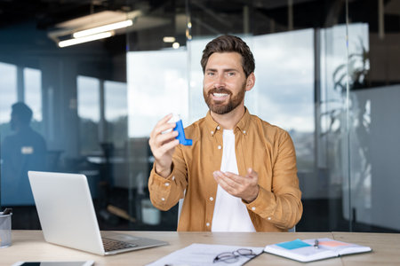 Smiling man sitting at an office desk holding an asthma inhaler, discussing healthcare management in the workplace and promoting wellness for employees