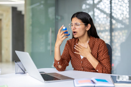 Young businesswoman experiencing an asthma attack while sitting at her desk, using an inhaler and struggling to breathe in front of her laptop at the office