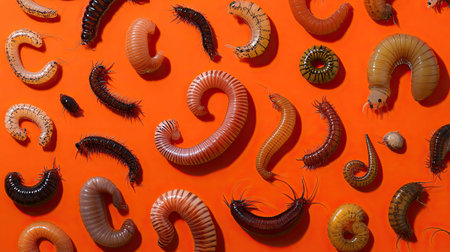 A captivating arrangement of various insect larvae and caterpillars against a bright orange background, showcasing diversity and detail in nature's life cycle.
