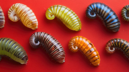 This vibrant image showcases a diverse collection of colorful caterpillars on a striking red background, highlighting the beauty of nature and insect life.