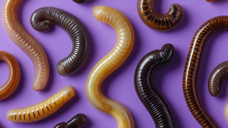 This high-resolution image presents segmented brown larvae on a vibrant purple background, highlighting natural textures and striking colors that evoke curiosity.