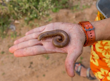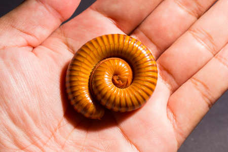 Macro of orange and brown millipede on hand of men, Millipede coiled, Disambiguation