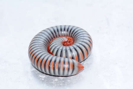 Close-up macro photo of a banded millipede curled in a spiral