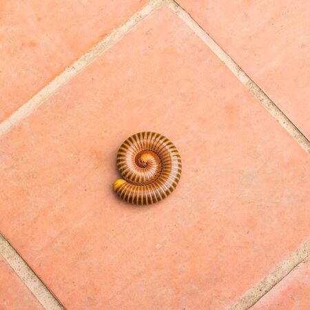 Millipedes (Graphidostreptus) rolled or coiling body to protect itself on the floor with afternoon sunlight shading