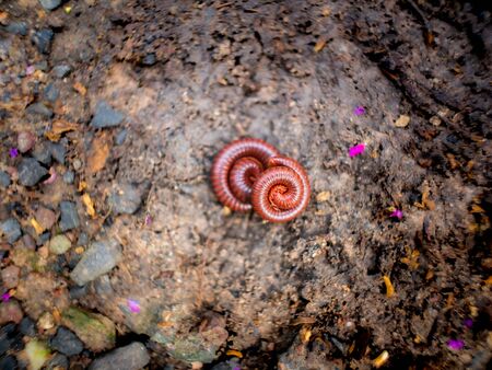 Red millipede on ground close up