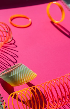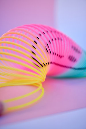 Rainbow, slinky toy and color spiral in studio for neon background for flexible, abstract or creative vaporwave aesthetic wallpaper. Colorful plastic spring backdrop for art, relax and happiness