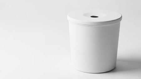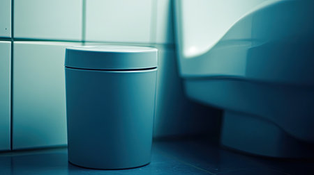 A modern bathroom scene showcases a stylish waste bin next to a clean toilet, highlighting minimalistic design and a focus on hygiene. The soft lighting enhances the serene atmosphere, making it an inviting space for daily routines.