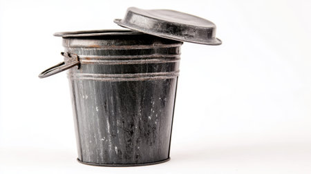 This image features a rustic black metal bucket with a lid, set against a clean white background. Ideal for creative projects, it emphasizes simplicity and utility in design.