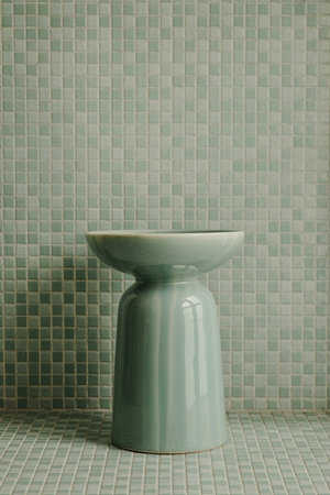 Glossy light green pedestal sink against matching small square tile background