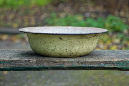 one old dirty yellow metal enameled bowl in a cobweb stands on a gray wooden table against a green background