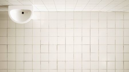View of the white toilet bowl in the toilet. Bathroom finished with white glaze tiles and white terracotta. Trash can and brush in the background