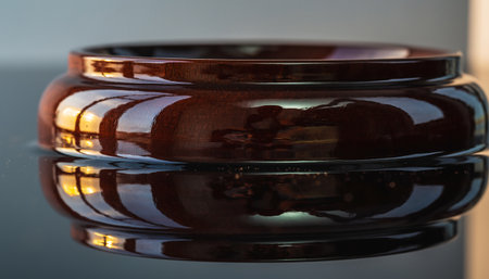 A close up shot of a ceramic bowl with a lot of reflection