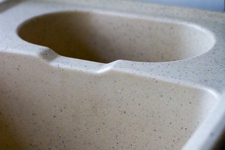 Kitchen sink from a light artificial stone on two bowls in a warehouse before installation in modern kitchen.