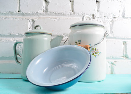 Lot of enameled dishes on a blue table against white brick wall background. Retro style cookware